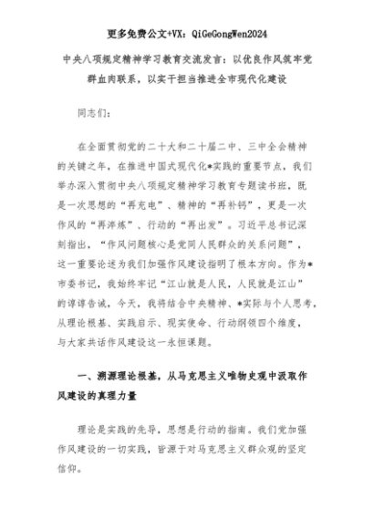 【七哥公文】2025年:中央八项规定精神学习教育交流发言:以优良作风筑牢党群血肉联系,以实干担当推进全市现代化建设+更多免费公文+VX:QiGeGongWen2024+更多免费公文+VX:QiGeGongWen2024