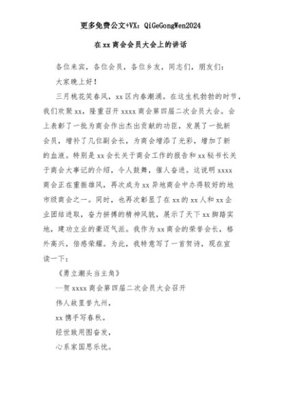 【七哥公文】2025年:在xx商会会员大会上的讲话+更多免费公文+VX:QiGeGongWen2024+更多免费公文+VX:QiGeGongWen2024