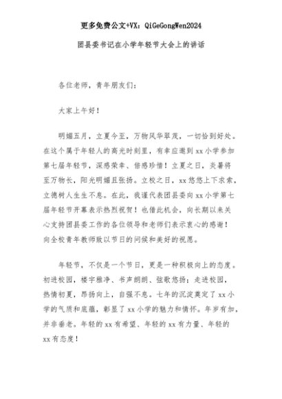 【七哥公文】2025年:团县委书记在小学年轻节大会上的讲话+更多免费公文+VX:QiGeGongWen2024+更多免费公文+VX:QiGeGongWen2024