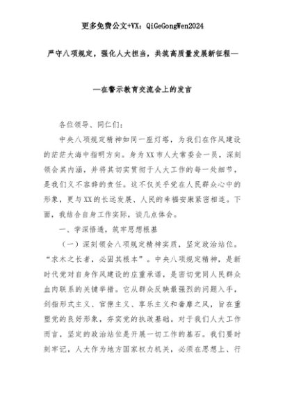 【七哥公文】2025年:严守八项规定,强化人大担当,共筑高质量发展新征程——在警示教育交流会上的发言+更多免费公文+VX:QiGeGongWen2024+更多免费公文+VX:QiGeGongWen2024