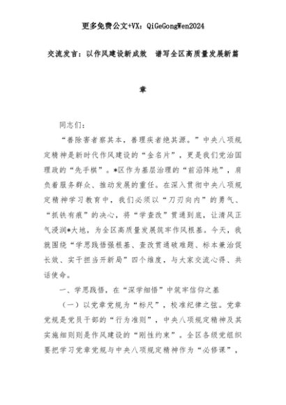 【七哥公文】2025年:交流发言:以作风建设新成效 谱写全区高质量发展新篇章+更多免费公文+VX:QiGeGongWen2024+更多免费公文+VX:QiGeGongWen2024