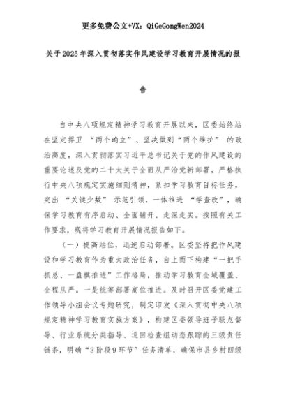 【七哥公文】2025年:关于2025年深入贯彻落实作风建设学习教育开展情况的报告+更多免费公文+VX:QiGeGongWen2024+更多免费公文+VX:QiGeGongWen2024