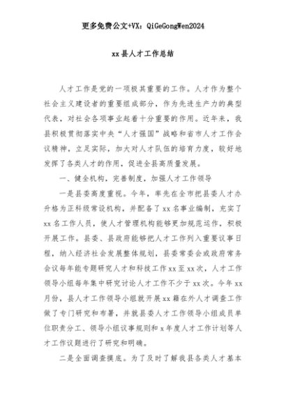 【七哥公文】2025年:xx县人才工作总结+更多免费公文+VX:QiGeGongWen2024+更多免费公文+VX:QiGeGongWen2024