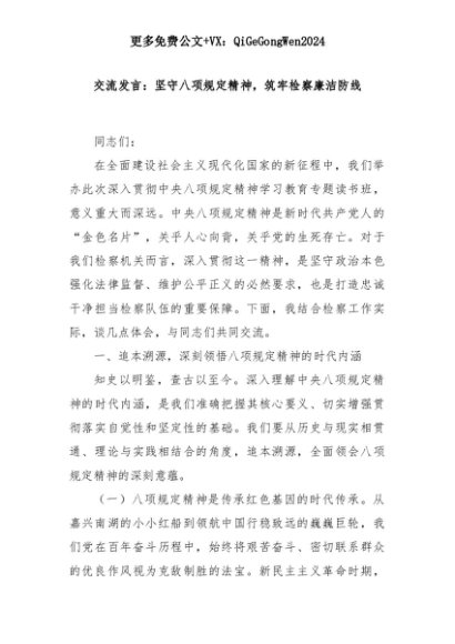 【七哥公文】2025年:交流发言:坚守八项规定精神,筑牢检察廉洁防线+更多免费公文+VX:QiGeGongWen2024+更多免费公文+VX:QiGeGongWen2024