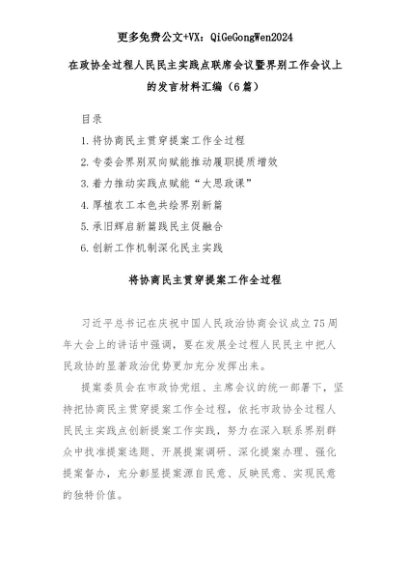 【七哥公文】2025年:(6篇)在政协全过程人民民主实践点联席会议暨界别工作会议上的发言材料汇编+更多免费公文+VX:QiGeGongWen2024+更多免费公文+VX:QiGeGongWen2024