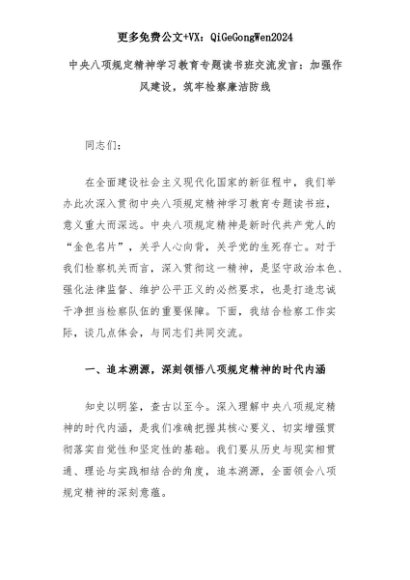 【七哥公文】2025年:中央八项规定精神学习教育专题读书班交流发言:加强作风建设,筑牢检察廉洁防线+更多免费公文+VX:QiGeGongWen2024+更多免费公文+VX:QiGeGongWen2024