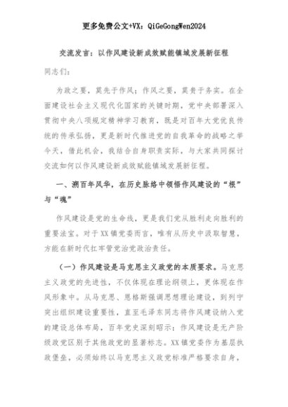 【七哥公文】2025年:交流发言:以作风建设新成效赋能镇域发展新征程+更多免费公文+VX:QiGeGongWen2024+更多免费公文+VX:QiGeGongWen2024