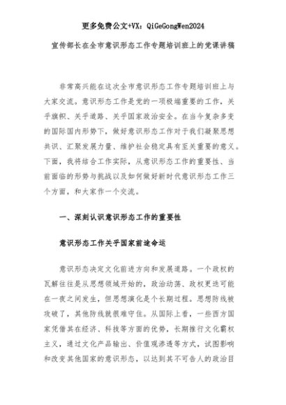 【七哥公文】2025年:【七哥公文】宣传部长在全市意识形态工作专题培训班上的党课讲稿+更多免费公文+VX:QiGeGongWen2024+更多免费公文+VX:QiGeGongWen2024