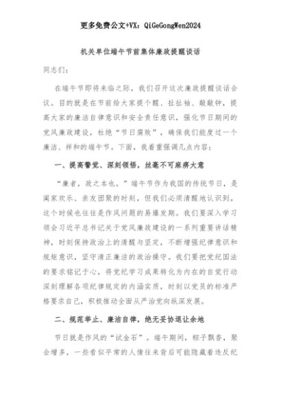 【七哥公文】2025年:【七哥公文】机关单位端午节前集体廉政提醒谈话+更多免费公文+VX:QiGeGongWen2024+更多免费公文+VX:QiGeGongWen2024