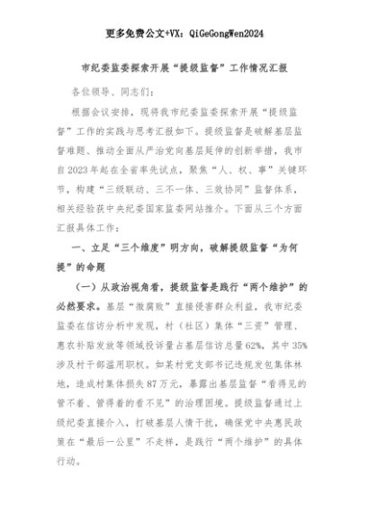 【七哥公文】2025年:【七哥公文】市纪委监委探索开展“提级监督”工作情况汇报+更多免费公文+VX:QiGeGongWen2024+更多免费公文+VX:QiGeGongWen2024
