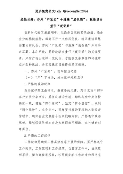 【七哥公文】2025年:【七哥公文】经验材料:作风“严紧实”+清廉“底色亮”:锻造堪当重任“硬脊梁”+更多免费公文+VX:QiGeGongWen2024+更多免费公文+VX:QiGeGongWen2024