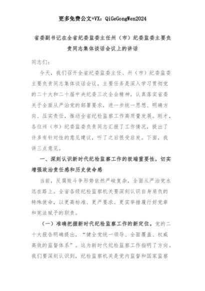 【七哥公文】2025年:【七哥公文】省委副书记在全省纪委监委主任州(市)纪委监委主要负责同志集体谈话会议上的讲话+更多免费公文+VX:QiGeGongWen2024+更多免费公文+VX:QiGeGongWen2024
