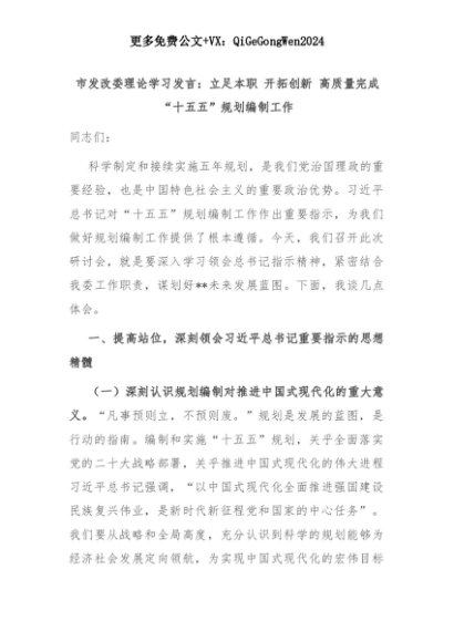 【七哥公文】2025年:【七哥公文】市发改委理论学习发言:立足本职 开拓创新 高质量完成“十五五”规划编制工作+更多免费公文+VX:QiGeGongWen2024+更多免费公文+VX:QiGeGongWen2024