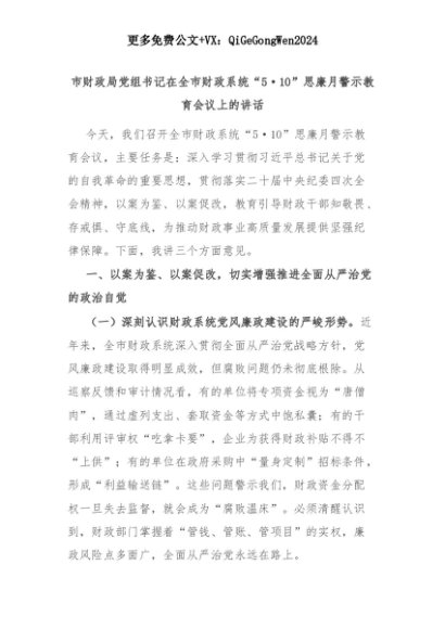 【七哥公文】2025年:【七哥公文】市财政局党组书记在全市财政系统“5·10”思廉月警示教育会议上的讲话+更多免费公文+VX:QiGeGongWen2024+更多免费公文+VX:QiGeGongWen2024
