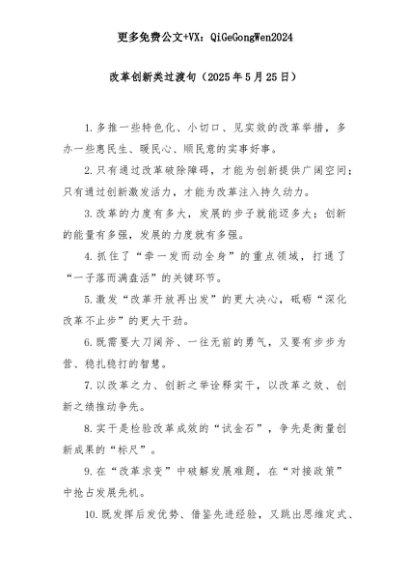 【七哥公文】2025年:【七哥公文】改革创新类过渡句(2025年5月25日)+更多免费公文+VX:QiGeGongWen2024+更多免费公文+VX:QiGeGongWen2024