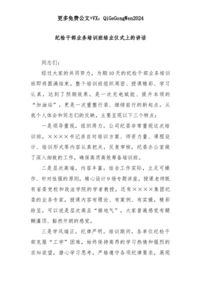 【七哥公文】2025年:【七哥公文】纪检干部业务培训班结业仪式上的讲话+更多免费公文+VX:QiGeGongWen2024+更多免费公文+VX:QiGeGongWen2024