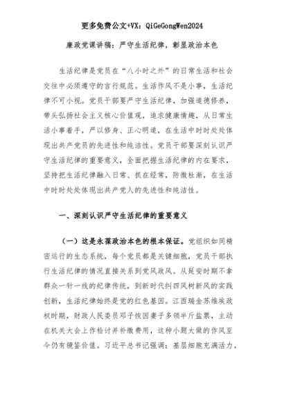 【七哥公文】2025年:【七哥公文】廉政党课讲稿:严守生活纪律,彰显政治本色+更多免费公文+VX:QiGeGongWen2024+更多免费公文+VX:QiGeGongWen2024