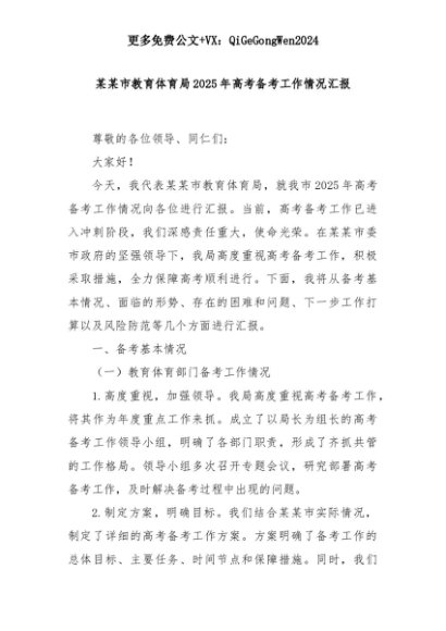 【七哥公文】2025年:【七哥公文】某某市教育体育局2025年高考备考工作情况汇报+更多免费公文+VX:QiGeGongWen2024+更多免费公文+VX:QiGeGongWen2024