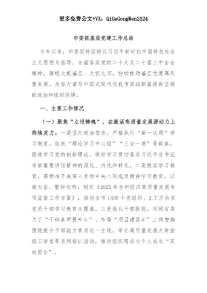 【七哥公文】2025年:【七哥公文】市委抓基层党建工作总结+更多免费公文+VX:QiGeGongWen2024+更多免费公文+VX:QiGeGongWen2024