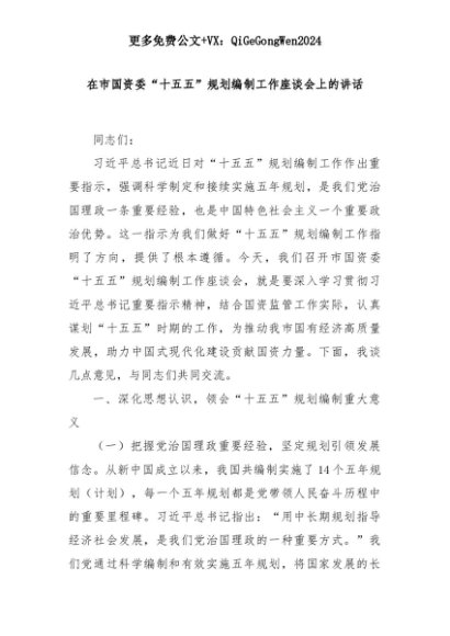 【七哥公文】2025年:【七哥公文】在市国资委“十五五”规划编制工作座谈会上的讲话+更多免费公文+VX:QiGeGongWen2024+更多免费公文+VX:QiGeGongWen2024