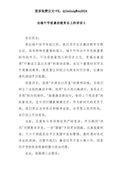 【七哥公文】2025年:在端午节前廉洁教育会上的讲话2+更多免费公文+VX:QiGeGongWen2024+更多免费公文+VX:QiGeGongWen2024