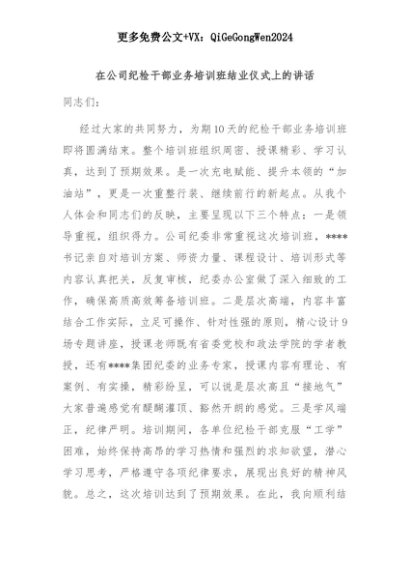 【七哥公文】2025年:【七哥公文】在公司纪检干部业务培训班结业仪式上的讲话+更多免费公文+VX:QiGeGongWen2024+更多免费公文+VX:QiGeGongWen2024