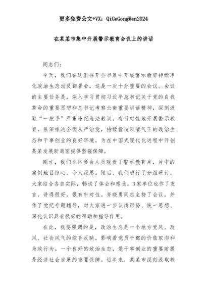 【七哥公文】2025年:【七哥公文】在某某市集中开展警示教育会议上的讲话+更多免费公文+VX:QiGeGongWen2024+更多免费公文+VX:QiGeGongWen2024