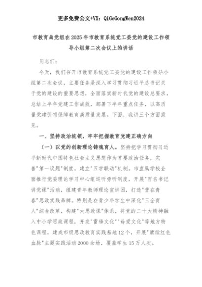 【七哥公文】2025年:市教育局党组在2025年市教育系统党工委党的建设工作领导小组第二次会议上的讲话+更多免费公文+VX:QiGeGongWen2024+更多免费公文+VX:QiGeGongWen2024