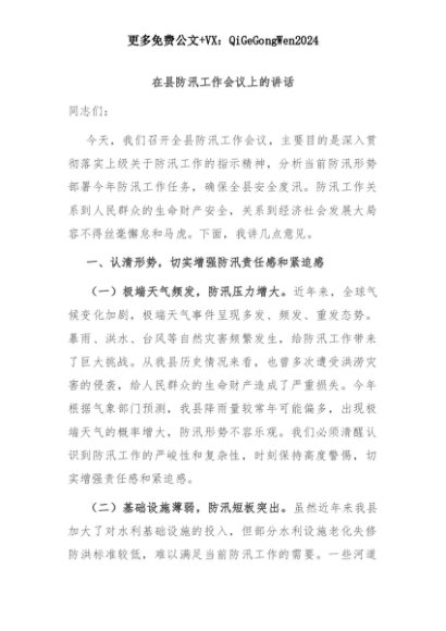 【七哥公文】2025年:【七哥公文】在县防汛工作会议上的讲话+更多免费公文+VX:QiGeGongWen2024+更多免费公文+VX:QiGeGongWen2024