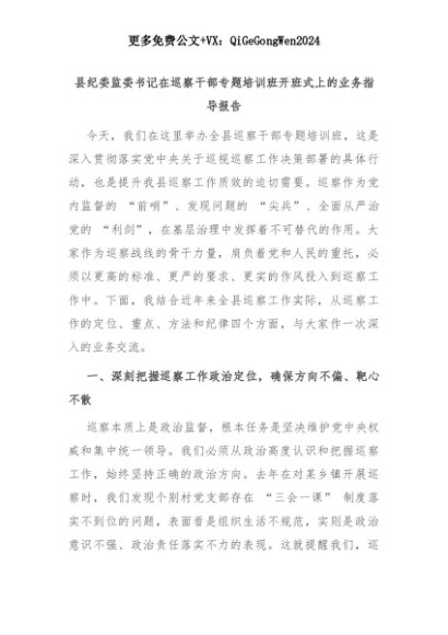【七哥公文】2025年:【七哥公文】县纪委监委书记在巡察干部专题培训班开班式上的业务指导报告+更多免费公文+VX:QiGeGongWen2024+更多免费公文+VX:QiGeGongWen2024