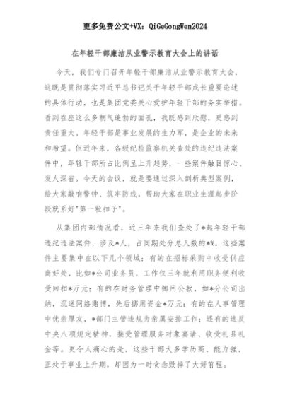 【七哥公文】2025年:【七哥公文】在年轻干部廉洁从业警示教育大会上的讲话+更多免费公文+VX:QiGeGongWen2024+更多免费公文+VX:QiGeGongWen2024