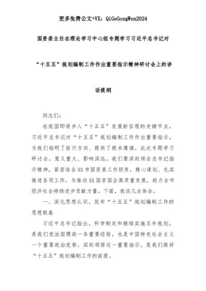 【七哥公文】2025年:【七哥公文】国资委主任在理论学习中心组专题学习习近平总书记对“十五五”规划编制工作作出重要指示精神研讨会上的讲话提纲+更多免费公文+VX:QiGeGongWen2024+更多免费公文+VX:QiGeGongWen2024