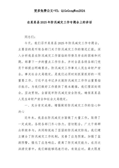 【七哥公文】2025年:【七哥公文】在某某县2025年防汛减灾工作专题会上的讲话+更多免费公文+VX:QiGeGongWen2024+更多免费公文+VX:QiGeGongWen2024