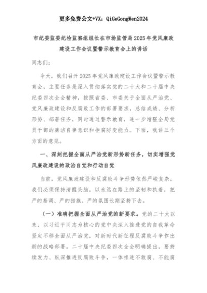 【七哥公文】2025年:市纪委监委纪检监察组组长在市场监管局2025年党风廉政建设工作会议暨警示教育会上的讲话+更多免费公文+VX:QiGeGongWen2024+更多免费公文+VX:QiGeGongWen2024