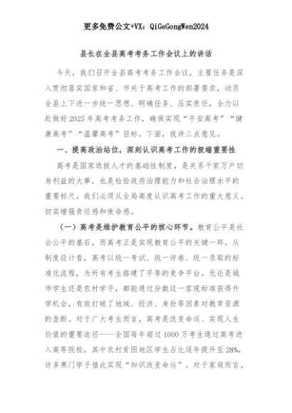 【七哥公文】2025年:【七哥公文】县长在全县高考考务工作会议上的讲话+更多免费公文+VX:QiGeGongWen2024+更多免费公文+VX:QiGeGongWen2024