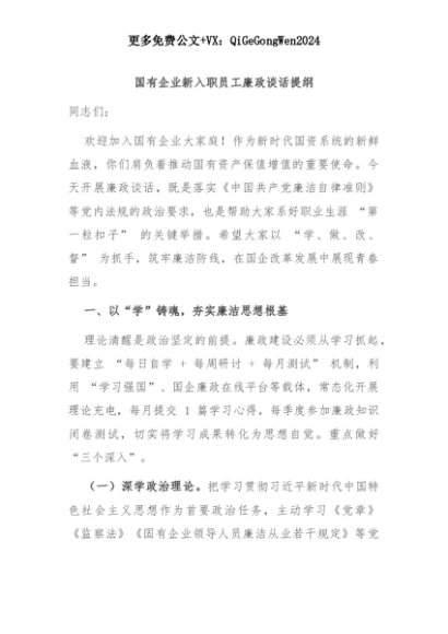 【七哥公文】2025年:【七哥公文】国有企业新入职员工廉政谈话提纲+更多免费公文+VX:QiGeGongWen2024+更多免费公文+VX:QiGeGongWen2024