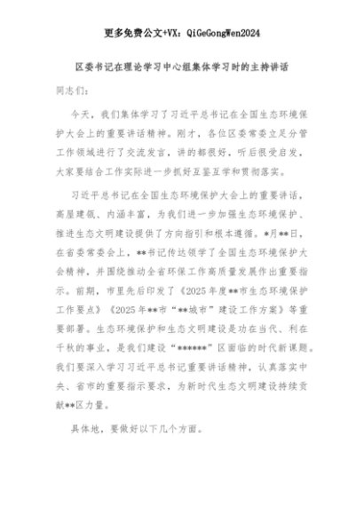 【七哥公文】2025年:【七哥公文】区委书记在理论学习中心组集体学习时的主持讲话+更多免费公文+VX:QiGeGongWen2024+更多免费公文+VX:QiGeGongWen2024