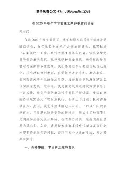 【七哥公文】2025年:【七哥公文】在2025年端午节节前廉政集体教育的讲话+更多免费公文+VX:QiGeGongWen2024+更多免费公文+VX:QiGeGongWen2024