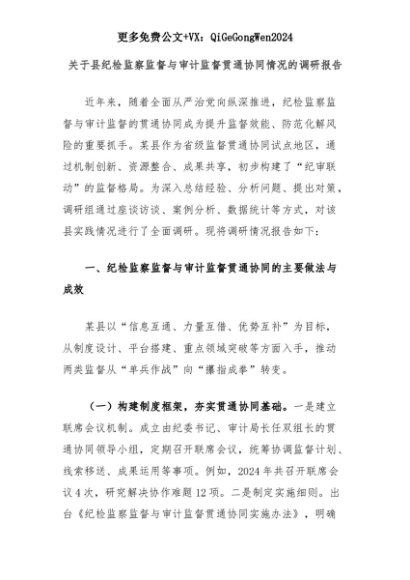 【七哥公文】2025年:【七哥公文】关于县纪检监察监督与审计监督贯通协同情况的调研报告+更多免费公文+VX:QiGeGongWen2024+更多免费公文+VX:QiGeGongWen2024