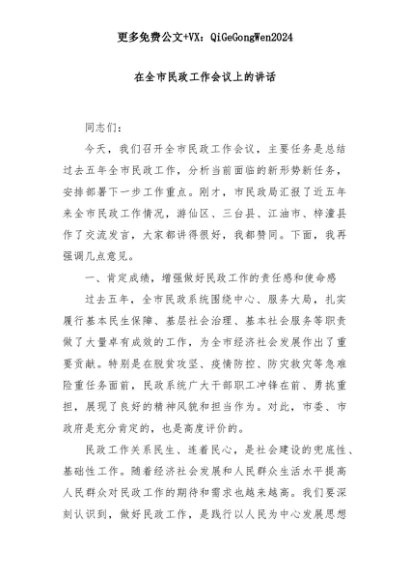 【七哥公文】2025年:【七哥公文】在全市民政工作会议上的讲话+更多免费公文+VX:QiGeGongWen2024+更多免费公文+VX:QiGeGongWen2024