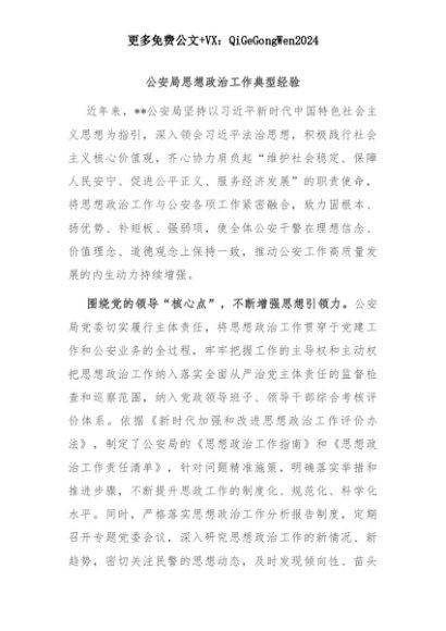 【七哥公文】2025年:【七哥公文】公安局思想政治工作典型经验+更多免费公文+VX:QiGeGongWen2024+更多免费公文+VX:QiGeGongWen2024