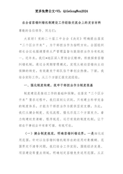 【七哥公文】2025年:【七哥公文】在全省容错纠错机制建设工作经验交流会上的发言材料+更多免费公文+VX:QiGeGongWen2024+更多免费公文+VX:QiGeGongWen2024