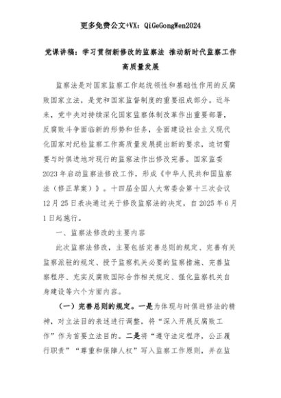 【七哥公文】2025年:【七哥公文】党课讲稿:学习贯彻新修改的监察法 推动新时代监察工作高质量发展+更多免费公文+VX:QiGeGongWen2024+更多免费公文+VX:QiGeGongWen2024