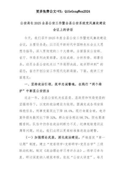 【七哥公文】2025年:【七哥公文】公安局长2025全县公安工作暨全县公安系统党风廉政建设会议上的讲话+更多免费公文+VX:QiGeGongWen2024+更多免费公文+VX:QiGeGongWen2024