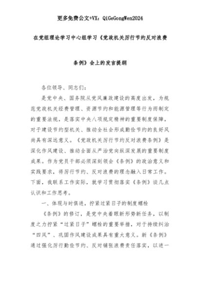 【七哥公文】2025年:【七哥公文】在党组理论学习中心组学习《党政机关厉行节约反对浪费条例》会上的发言提纲+更多免费公文+VX:QiGeGongWen2024+更多免费公文+VX:QiGeGongWen2024