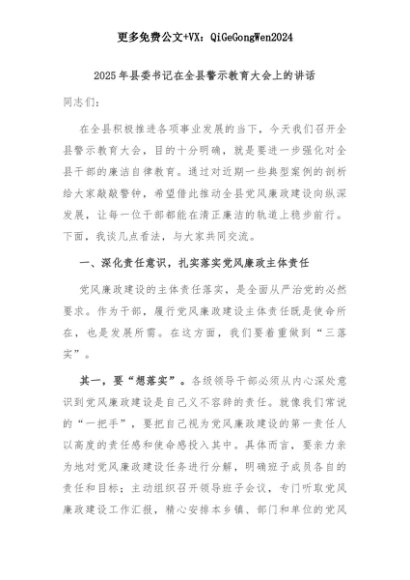 【七哥公文】2025年:【七哥公文】2025年县委书记在全县警示教育大会上的讲话+更多免费公文+VX:QiGeGongWen2024+更多免费公文+VX:QiGeGongWen2024