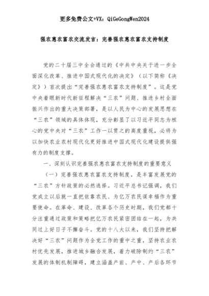 【七哥公文】2025年:强农惠农富农交流发言:完善强农惠农富农支持制度+更多免费公文+VX:QiGeGongWen2024+更多免费公文+VX:QiGeGongWen2024