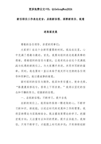【七哥公文】2025年:新任职位工作表态发言:启航新征程、深耕新岗位、锐意进取谋发展+更多免费公文+VX:QiGeGongWen2024+更多免费公文+VX:QiGeGongWen2024