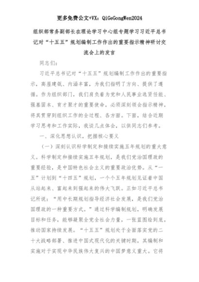 【七哥公文】2025年:组织部常务副部长在理论学习中心组专题学习习近平总书记对“十五五”规划编制工作作出的重要指示精神研讨交流会上的发言+更多免费公文+VX:QiGeGongWen2024+更多免费公文+VX:QiGeGongWen2024