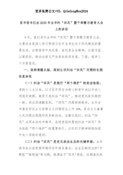 【七哥公文】2025年:某市委书记在2025年全市纠“四风”暨干部警示教育大会上的讲话+更多免费公文+VX:QiGeGongWen2024+更多免费公文+VX:QiGeGongWen2024